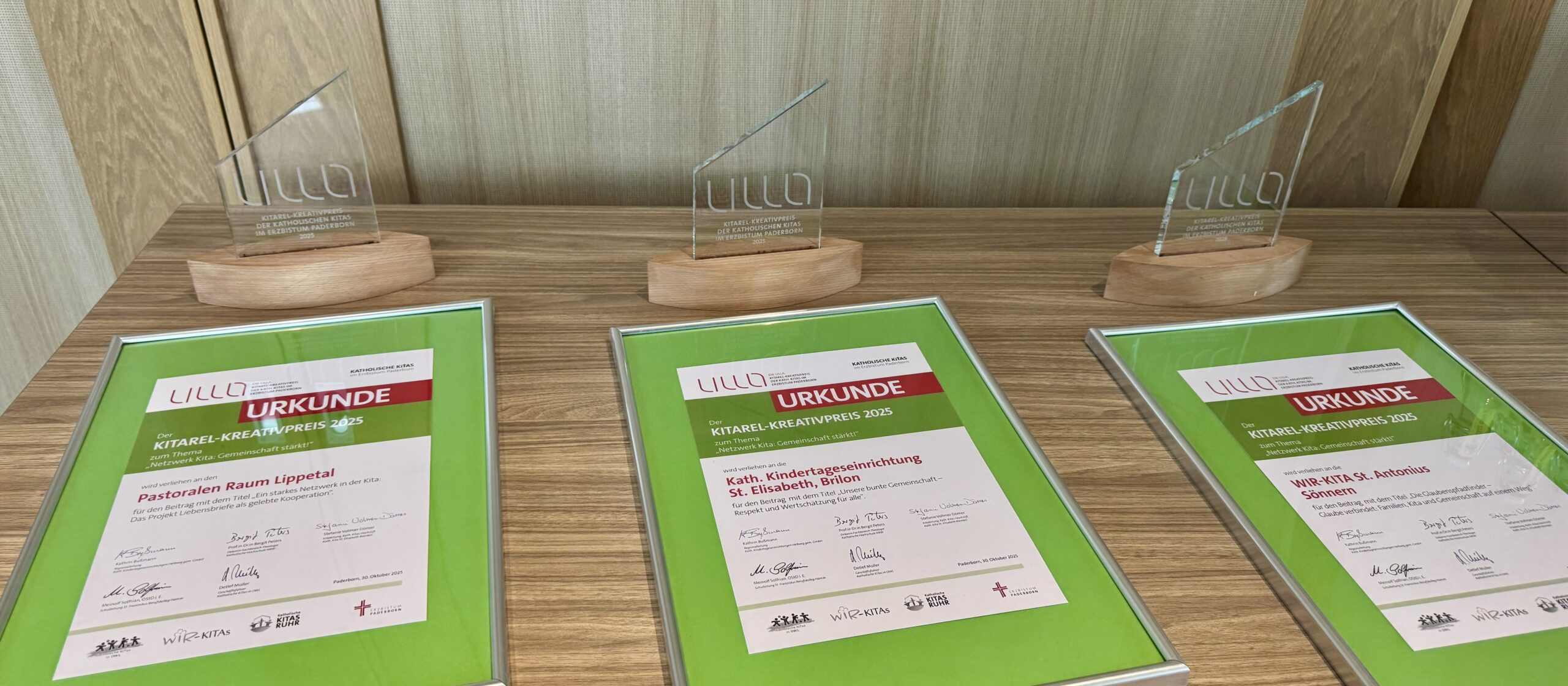 Es hätte keinen passenderen Ort für die Feier von Gemeinschaft und mutiger Religionspädagogik in der Kita geben können als das DPSG-Diözesanzentrum Rüthen „Haus am Eulenspiegel“. Dort wurde zum Namenstag der Heiligen Ursula Ende Oktober der neunte KitaRel-Kreativpreis DIE ULLA. 2025 verliehen. Das stilisierte Schiff wanderte in diesem Jahr zusammen mit je von den Kita gem. GmbHs und der Pax-Bank für Kirche und Caritas gestifteten 500 Euro in zwei WIR-Kitas nach Sönnern und Brilon. Der dritte unter der Schirmherrschaft Generalvikar Dr. Bredeck stehende Preis wurde erstmals an ein bistumsübergreifendes Projekt übergeben, an dem im Pastoralen Raum Lippetal alle sechs Kitas aus dem Erzbistum Paderborn und dem Bistum Münster sowie die drei Grundschulen beteiligt waren.