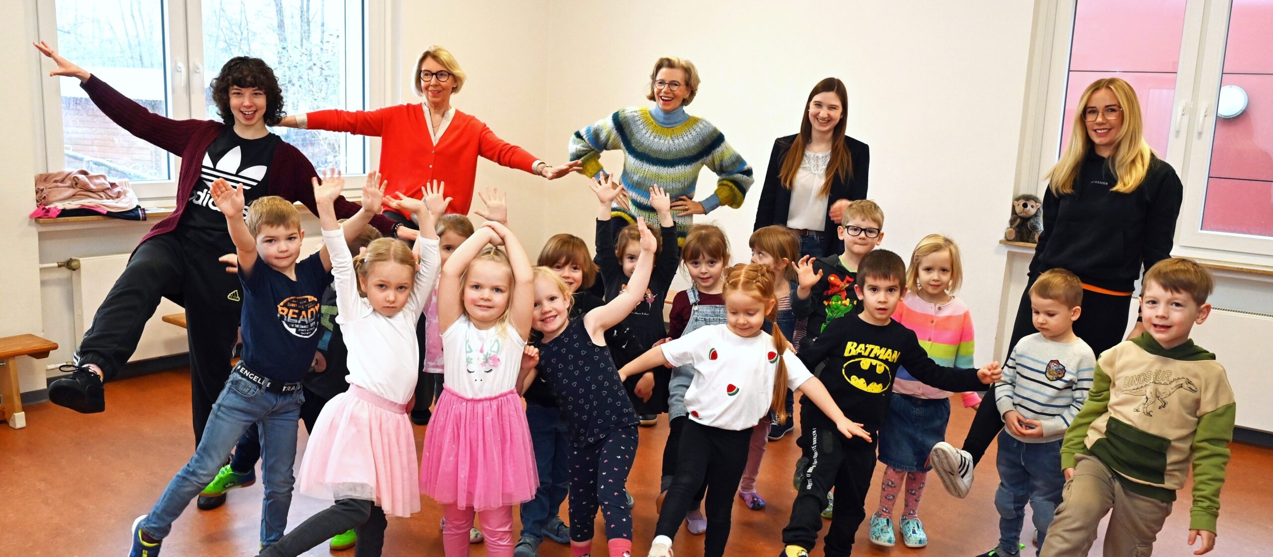 Foto: Die 21-jährige Tanzlehrerin Finja (links) versteht es, die Kinder mit Spaß in Bewegung zu versetzen. Der Besuch vom Inner Wheel Club, Henrika Küppers und Ute Luther, sowie auch die Leiterin Katharina Grütt machen spontan mit. Es ist gar nicht so leicht auf einem Bein zu stehen und dabei die Balance zu halten, mussten sie feststellen.