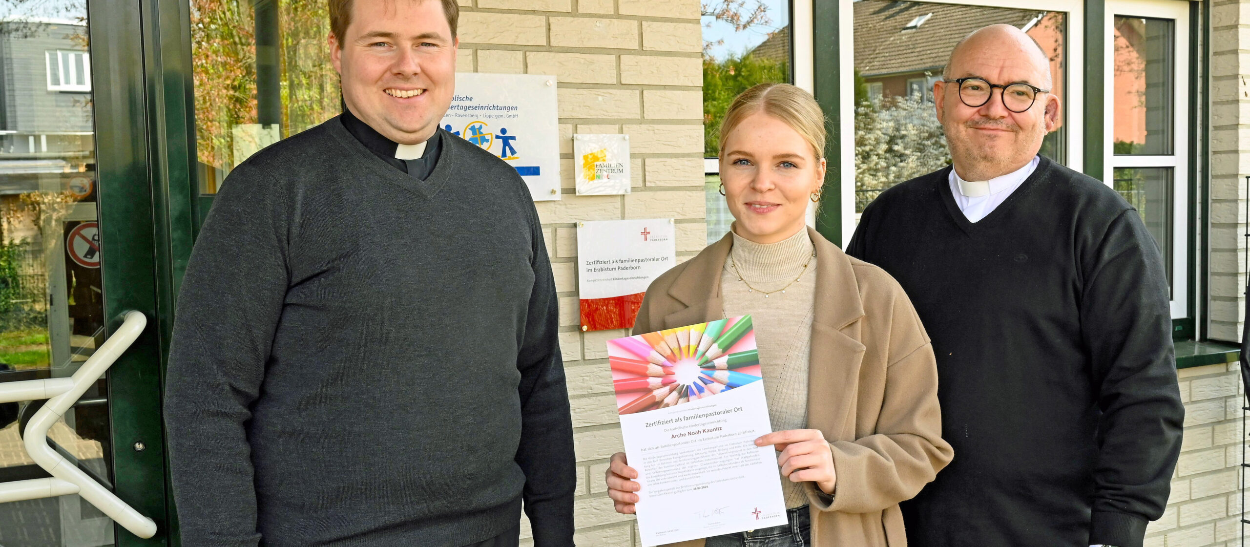 Verl-Kaunitz. Mit seinem Zertifikat „KiTa als familienpastoraler Ort“ profiliert und unterstützt das Erzbistum Paderborn seit 2014 die Kindertageseinrichtungen in ihrem Wirken als familienpastorale Orte.  „Arche Noah“ Leiterin Jana Höwelkröger hat nun durch Pfarrer Karl-Josef Auris und Pastor Benedikt Kickum das Zertifikat für die Rezertifizierung erhalten. „Wir sind stolz darauf, ein Ort zu sein, an dem Kinder Werte vermittelt bekommen, religiöse Bildung erfahren und familiär aufwachsen“, betont die junge Leitung. Das Erzbistum würdigt mit seinem Zertifikat die große Rolle der Kitas, die jeden Tag Familien begleiten, mit Gott in Berührung bringen und das kirchliche und gesellschaftliche Leben vorleben. Mit der Zertifizierung macht die Kita deutlich: Familienpastorale Aktivitäten in den Bereichen Evangelisierung, Beratung, Politik, Bildung, Hilfe und die Vernetzung der Angebote für Familien im Pastoralen Raum gehören zum Selbstverständnis die Kita.
