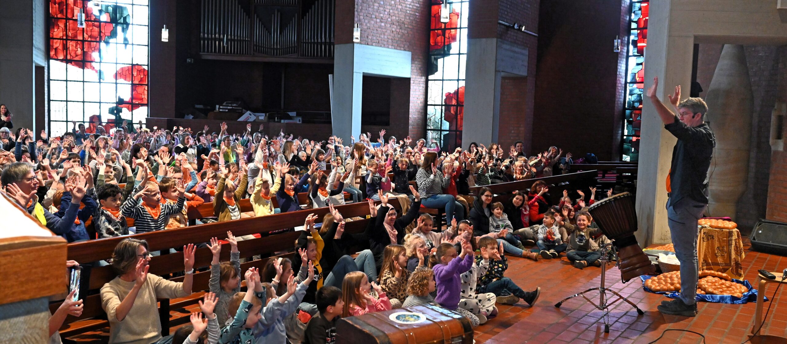 Rheda-Wiedenbrück. 400 Kinder aus 20 Kindertagesstätten der Regionen Rheda-Wiedenbrück, Rietberg, Herzebrock-Clarholz und Langenberg gingen auf eine spannende Trommelreise nach Afrika und lernten dabei, wie wichtig es ist, zusammen zu halten und zu teilen. Die Kinder belebten die St. Johannes Kirche in der Nonenstraße mit ihren Trommeln.  Trommel-Reiseleiter Markus Hoffmeister erzählte den Mädchen und Jungen spannende Geschichten von den Tieren in Afrika und sang tolle Lieder mit den kleinen Reisegästen. Die kleine Geschichte handelte davon, dass der große Elefant das wenige Wasser für sich haben wollte. Er beauftragte die Schildköte, darauf aufzupassen, damit er zum Fressen gehen kann. Die Schildkröte sagte ein paarmal nein, als durstige Tiere kamen. Doch irgendwann sprach ihr Herz und sie erlaubte den kleinen Hasen ein bisschen Wasser zu trinken. Die anderen Tiere fanden das ungerecht und forderten auch ihren Teil. Am Ende war der Wasservorrat stark geschrumpft und der Elefant wollte die Schildkröte zur Strafe fressen. Da hielten alle Tiere zusammen und retteten die Schildkröte, denn schließlich hat sie sie vor dem Verdursten bewahrt. Das Wasser war ab dann für ALLE Tiere da!