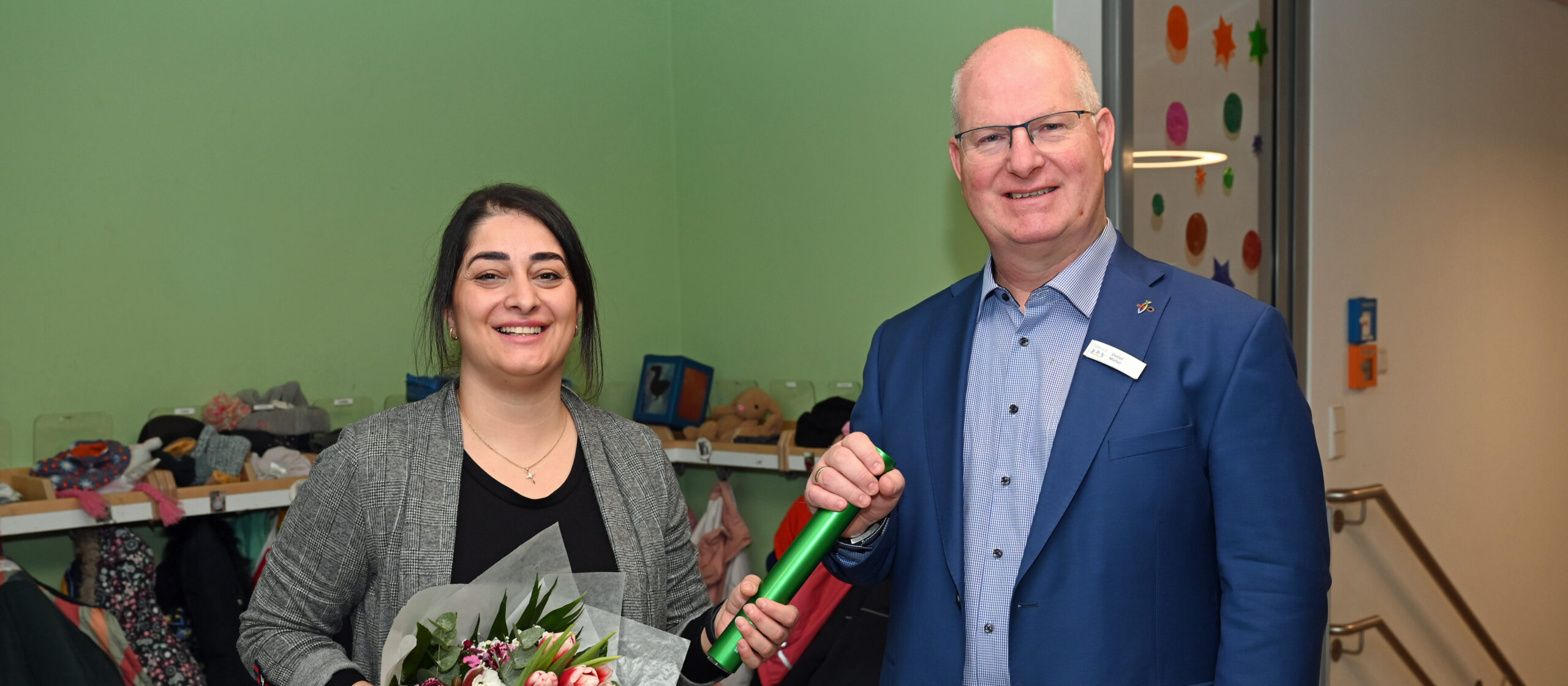 Romina Yousefzadeh bekommt von Träger-Geschäftsführer Detlef Müller den Staffelstab für ihre neu begonnene Funktion als Leitung der Kita Herz Jesu in Halle überreicht.