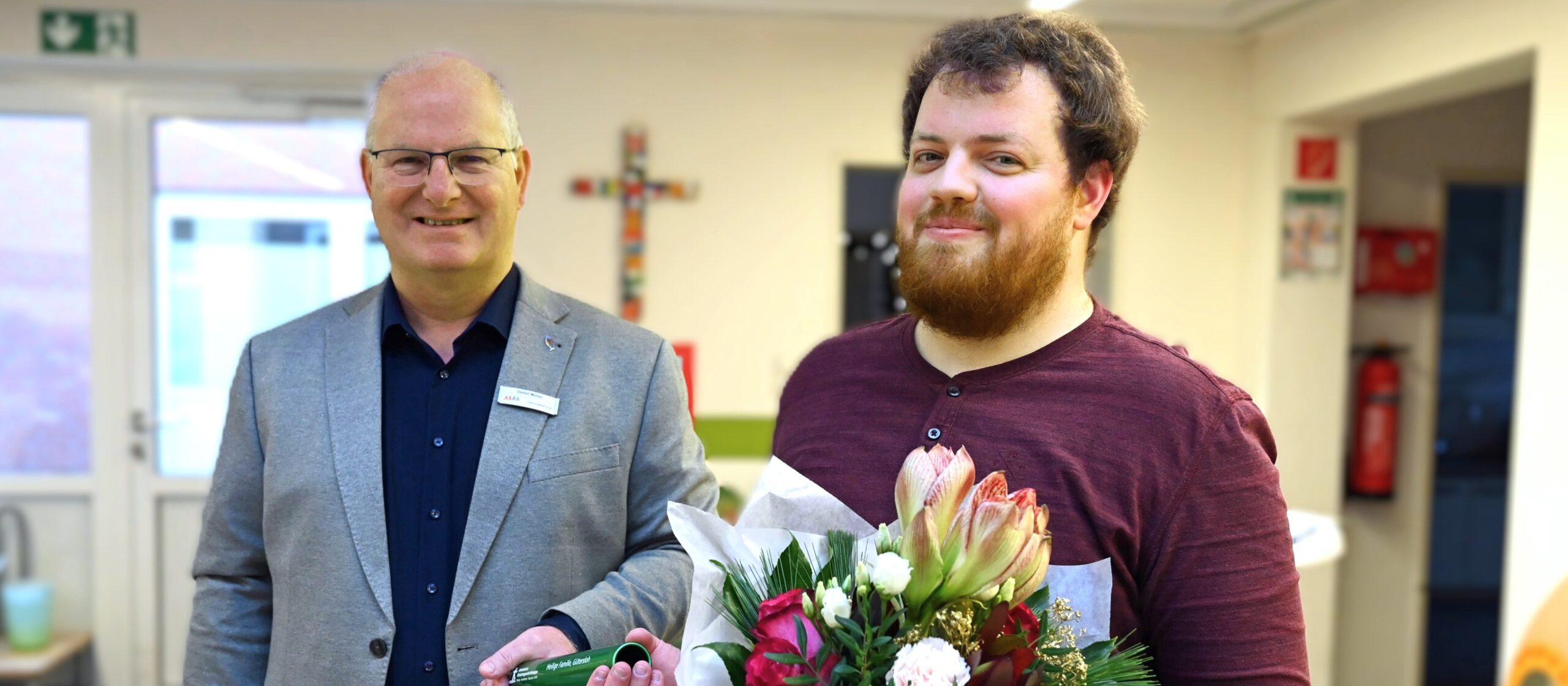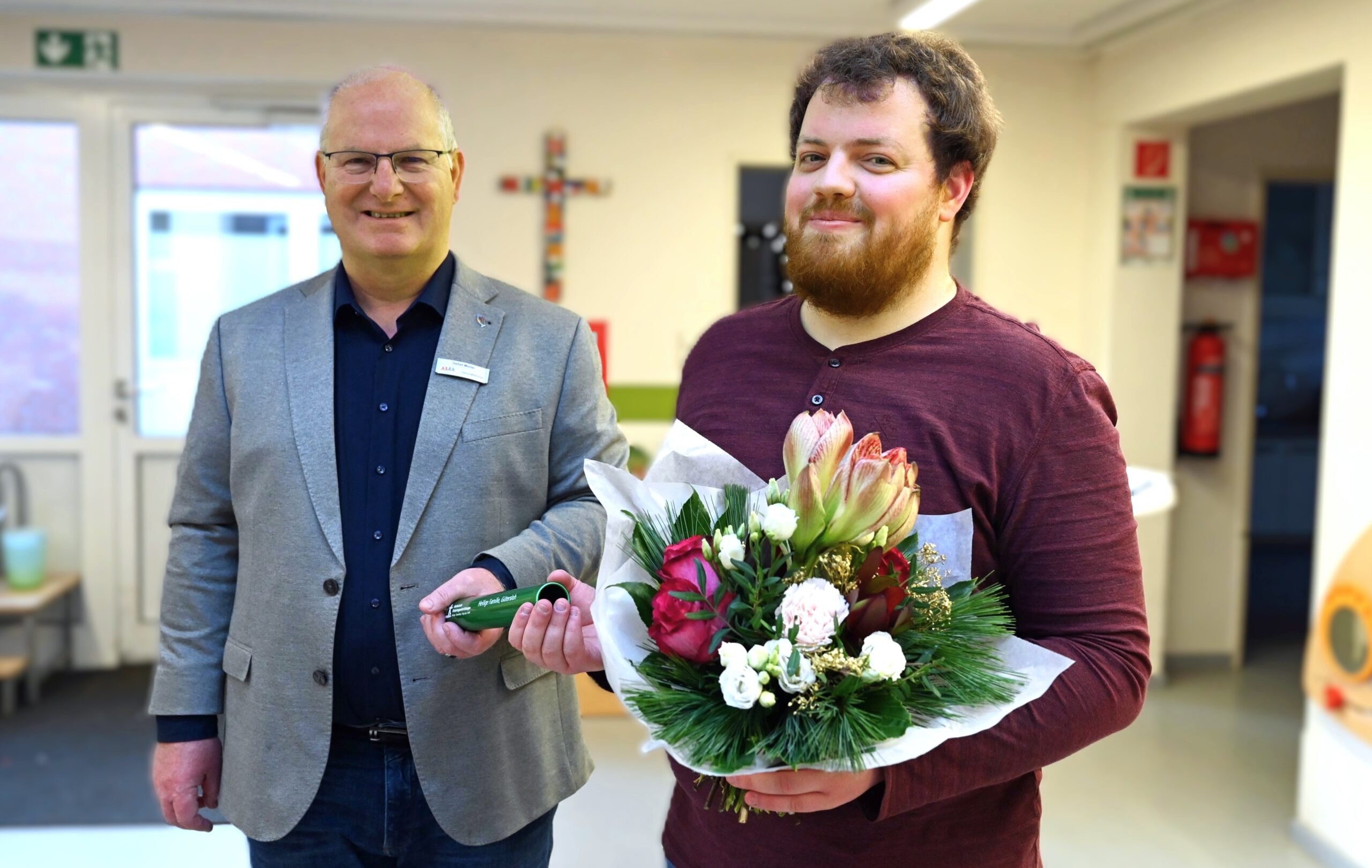 Träger-Geschäftsführer Detlef Müller hieß den jungen Erzieher herzlich willkommen und überreichte ihm offiziell den Staffelstab als Symbol für die leitende Tätigkeit.
